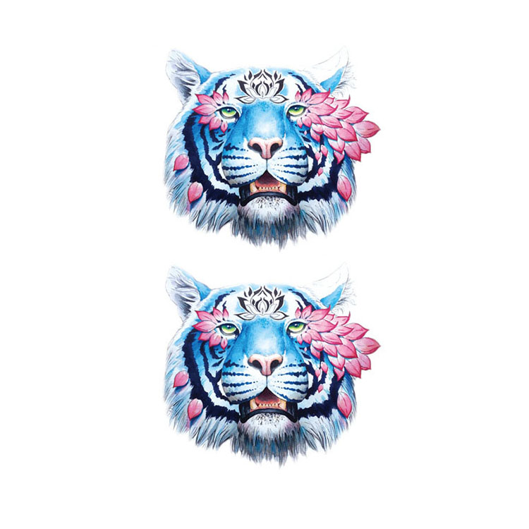 Festival Spirit Tiger zijn twee tijdelijke tattoos op een vel van 12 x 19 cm die direct de aandacht trekt. Dit indrukwekkende ontwerp toont een felblauwe tijgerkop met helder groene ogen, versierd met roze lotusbladeren aan de zijkant en een spirituele mandala op het voorhoofd. Het dubbele ontwerp straalt kracht en mystiek uit, perfect passend bij festivals, feestjes of zomerse avonturen.