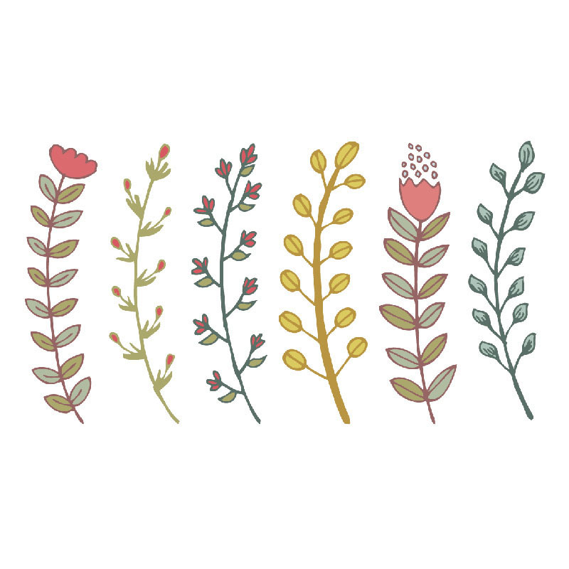 Elke stengel heeft zijn eigen karakter: van roodroze bloesemknopjes tot gele bolletjes en grijsgroene blaadjes — alsof ze met de hand getekend zijn in een modern schetsboek. De stijl is luchtig, vrolijk en elegant, met een vleugje Scandinavische eenvoud. De fijne details en zachte kleuren maken ze ideaal voor mensen die een natuurlijke look zoeken zonder opvallende contrasten.