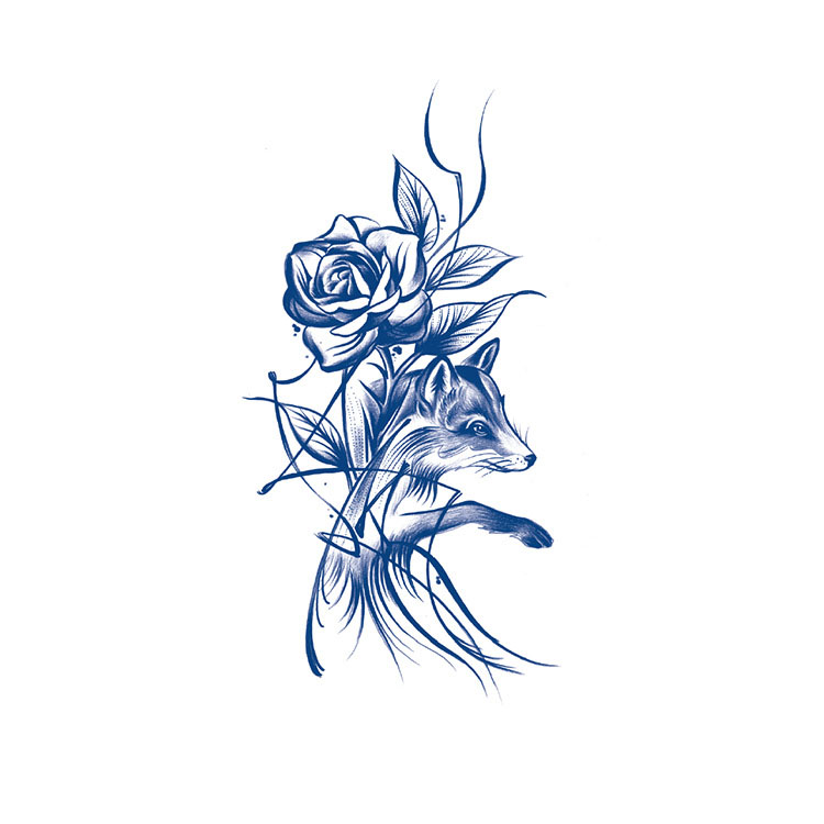 Laat je huid spreken met de tijdloze uitstraling van “Fox and Bloom” — een tijdelijke tattoo van 70 x 120 mm waarin natuur, mystiek en stijl samenkomen. In dit verfijnde ontwerp zie je een sierlijke vos die deels verscholen zit tussen een bloeiende roos en een spel van zwierige lijnen. Het resultaat is een artistieke compositie vol beweging en symboliek.