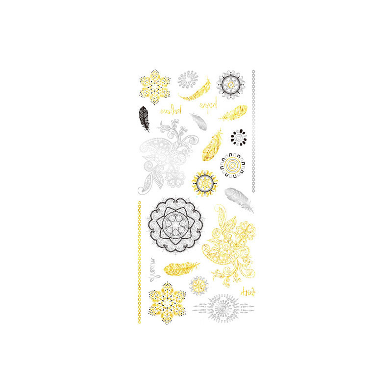Golden Bloom is een tijdelijke 3-dagen tattoo in goud- en zilverlook met mandala’s, bloemen en spirituele symbolen. De delicate metallic glans maakt het ontwerp sierlijk als een sieraad. Draag het op festivals, stranddagen of spirituele momenten. Deze tattoo laat je niet alleen stralen – hij vertelt ook een verhaal.