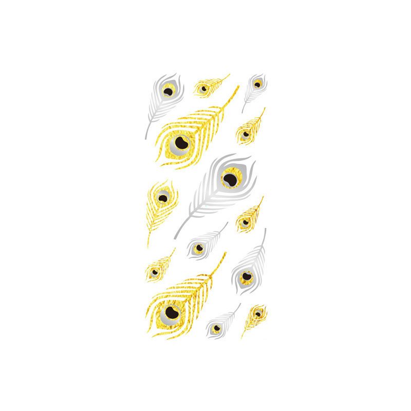Golden Peacock is een tijdelijke tattoo die je huid siert met de sierlijkheid van pauwenveren in glanzend goud en zilver. Elke veer is met finesse ontworpen en lijkt haast te dansen op je huid, alsof je een accessoire draagt uit een betoverende droom. Het subtiele lijnwerk en de metallic afwerking geven het ontwerp een luxueuze uitstraling die doet denken aan handgemaakte sieraden.