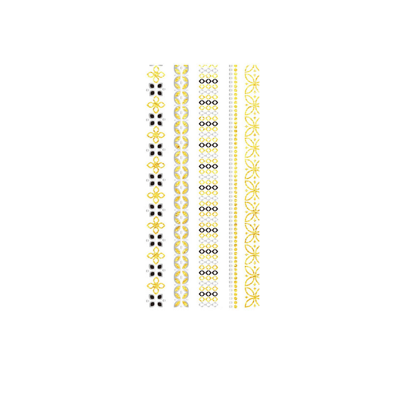 De Golden Sparkle Lines is een elegante 3-dagen tattoo vol glanzende goud- en zilverdetails. Het subtiele patroon straalt luxe en klasse uit, perfect voor festivals, stranddagen of feestjes. Combineer de verschillende lijnen tot jouw unieke stijl. Makkelijk aan te brengen en voelt aan als een echt sieraad op de huid.