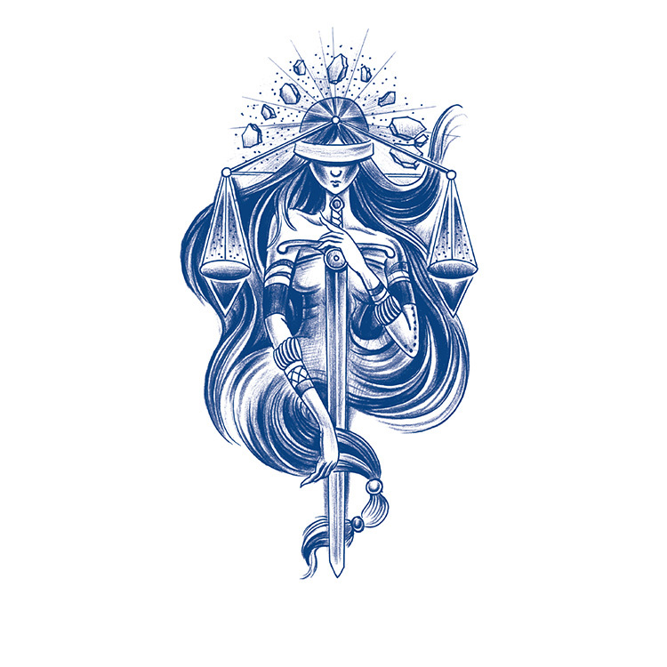 De illustratie is prachtig gedetailleerd met vloeiende haarlijnen, strakke vormen en een mystieke opbouw van edelsteenachtige figuren rondom haar hoofd. Deze fonkelende kristallen boven haar blinddoek geven haar iets hemels, bijna goddelijks. Ze versterken het gevoel dat deze tattoo niet alleen over wet en rechtspraak gaat, maar ook over innerlijke balans en spirituele kracht.