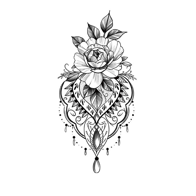 Luna Rosaria is een elegante 3 dagen tattoo die stijl, spiritualiteit en vrouwelijke kracht samenbrengt in één verfijnd ontwerp. Centraal staat een realistisch uitgewerkte bloem, omgeven door symmetrische mandalapatronen, bladeren en fijne sierdetails. Onderaan hangt een druppelvormig ornament — alsof je een edelsteen op je huid draagt.