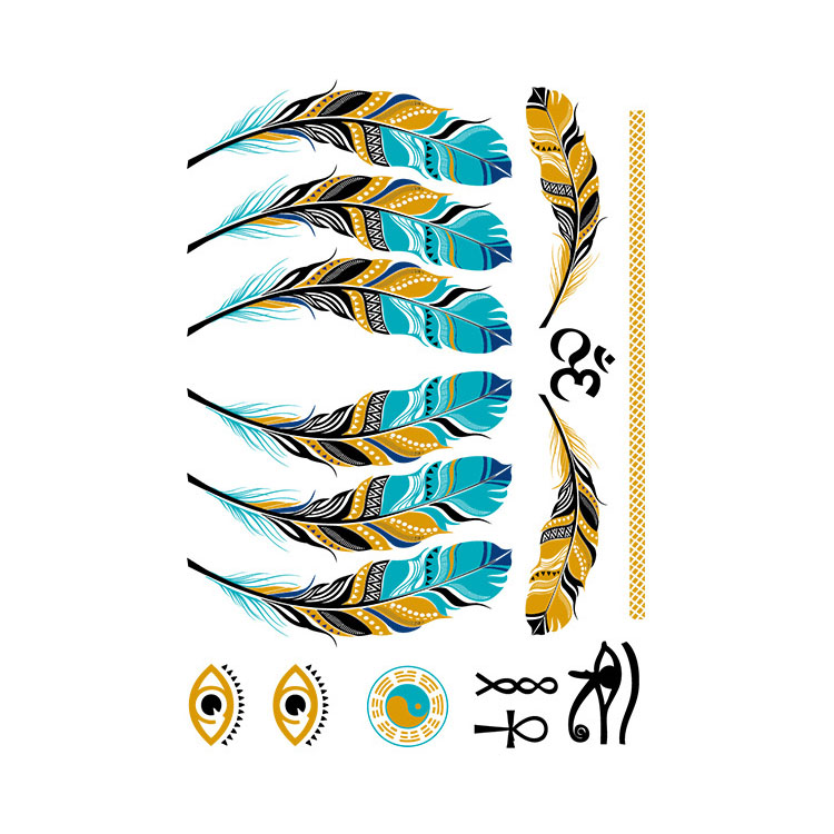 Mystic Feather Flow is een magisch tattoo vel vol spirituele symbolen, sierveren en tribal details. De combinatie van goud, turquoise en zwart maakt het een opvallend ontwerp voor wie houdt van mystiek en betekenis. De tattoos zijn perfect voor op je arm, schouder of onderarm. Het vel is 14,8 x 21 cm groot en blijft 3 dagen zitten.