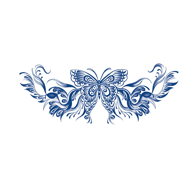 Mystic Flight is een elegante 2-weken tattoo van 11 x 18 cm met een sierlijke vlinder in het midden, omringd door vloeiende lijnen. Dit ontwerp staat symbool voor vrijheid en schoonheid. Blijft 10 tot 18 dagen zichtbaar op de huid en is perfect voor zowel de onderrug als het sleutelbeen.