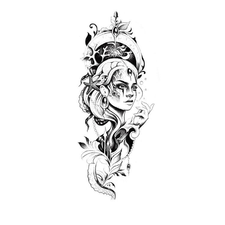 Deze tattoo is perfect voor iedereen die zich verbonden voelt met het oceaanleven, spiritualiteit of mystieke schoonheid. De zwarte en grijze schaduwen zorgen voor een realistisch effect zonder kleur, waardoor hij prachtig afsteekt op elke huid. De fijne details – zoals het koraalornament boven haar hoofd en de sierlijke lijnen die zich langs haar arm en haar vormen slingeren – geven de tattoo een luxe en artistieke uitstraling.