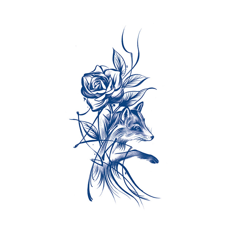 Rosewood Gaze is een verfijnde 2-weken tattoo waarin natuurlijke vormen en moderne lijnvoering harmonieus samenkomen. Het ontwerp toont een rustige, gefocuste vos die zich deels verschuilt achter een prachtig uitgewerkte roos. Om het geheel bewegen lange, gebogen lijnen en fijne details die het beeld lucht geven en versterken.