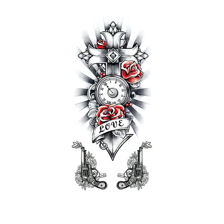 Sacred Love Clock is een tijdelijke tattoo van 9 x 19 cm die ongeveer 3 dagen blijft zitten. Het ontwerp combineert klassieke en betekenisvolle elementen: een decoratief kruis, een klok met Romeinse cijfers, rode rozen en een sierlint met het woord ‘LOVE’. Onderaan het vel vind je twee gedetailleerde revolvers, die artistiek zijn ingebed in een bloemencompositie.