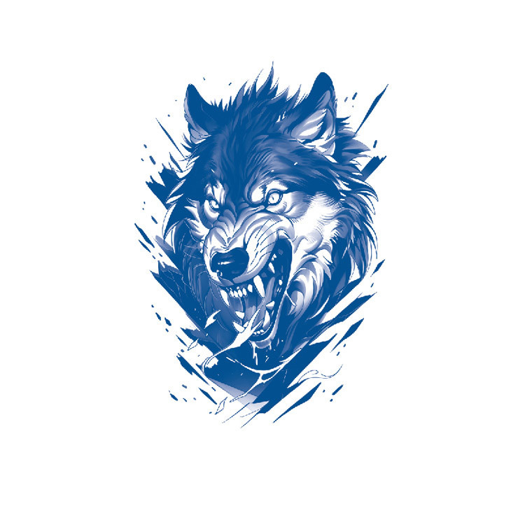 De tattoo is uitgevoerd in grijzige blauwtinten met scherpe, hoekige lijnen en een bijna brushstroke-achtig achtergrondontwerp. Dit zorgt voor een moderne, bijna stripboekachtige uitstraling, zonder het realisme te verliezen. Het ontwerp komt prachtig tot zijn recht op de bovenarm, schouder, rug of borst.