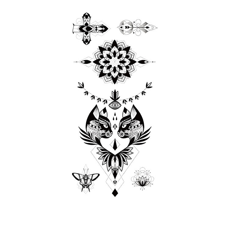 Spirit Guardian is een indrukwekkende tijdelijke tattoo van 9 x 19 cm die symmetrie, mystiek en spirituele kracht samenbrengt. Dit ontwerp bevat meerdere losse elementen die afzonderlijk of gecombineerd gedragen kunnen worden. Centraal staan twee kattenkoppen, versierd met tribal-achtige details en florale motieven. In veel culturen staat de vos symbool voor wijsheid, intuïtie en bescherming — als een stille wachter over je energie.