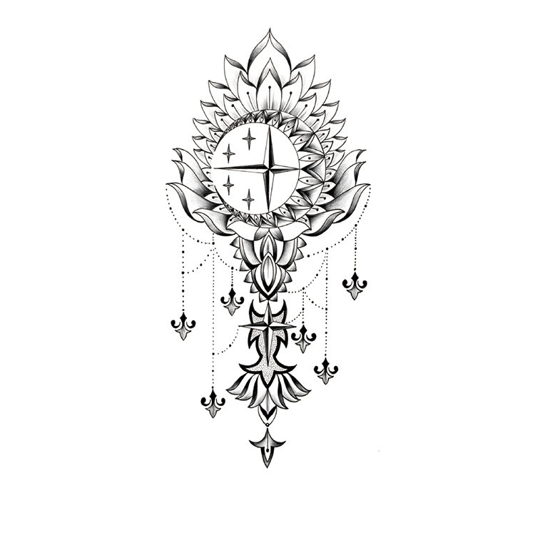 Stellar Bloom is een tijdelijke tattoo op een vel van 11,4 x 21 cm. Een prachtige combinatie van een kompasster, sterrenhemel, lotusvormen en elegante sierhangers. Deze 3-dagen tattoo straalt rust, richting en schoonheid uit. Ideaal voor wie zich wil verbinden met het universum én zijn of haar eigen pad.