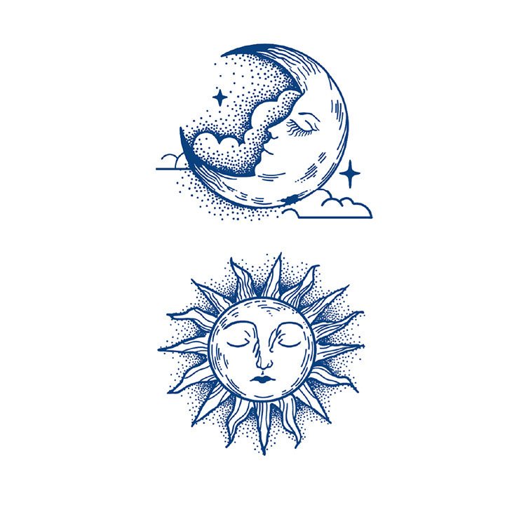 Sun and Moon is een prachtig uitgebalanceerd tattoo vel met twee afzonderlijke 2 weken tattoos van elk 7 x 12 cm. Het ontwerp bevat een sfeervolle maan met een dromerig gezicht, omgeven door wolken en sterren, én een kalme zon met gesloten ogen en sierlijke stralen. Samen verbeelden ze het klassieke evenwicht tussen licht en donker, actie en rust, dag en nacht.