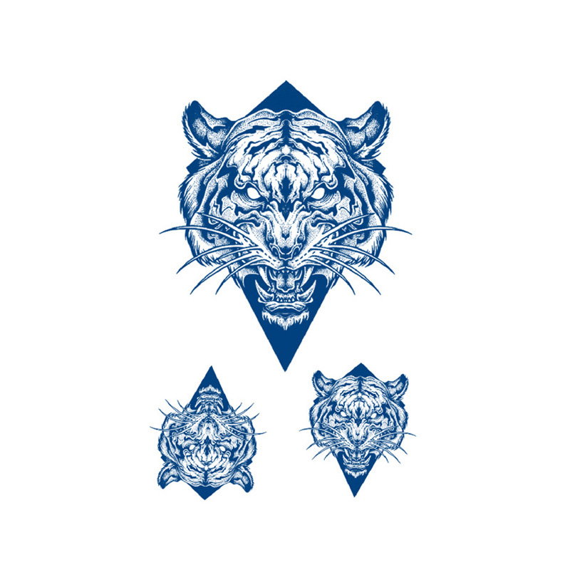 Tiger Spirit Set is een indrukwekkende 2-weken tattoo voor iedereen die kracht, instinct en leiderschap wil uitstralen. Op dit vel van 11 x 18 cm staan drie gedetailleerde tijgerkoppen afgebeeld, elk verpakt in een strakke diamantvorm. De grijsblauwe lijnen geven het ontwerp een artistieke, bijna geëtste uitstraling — alsof het met zorg is gesneden in de huid.