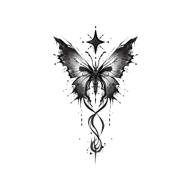 Boven de vlinder prijkt een zwarte ster, die het ontwerp extra diepte geeft en een spirituele dimensie toevoegt. Onder de vlinder kronkelen sierlijke lijnen omlaag, die het geheel een sierlijk, bijna hypnotiserend effect geven. De combinatie van scherpe vormen, vloeiende lijnen en donkere accenten maakt deze tattoo zeer uitgesproken.